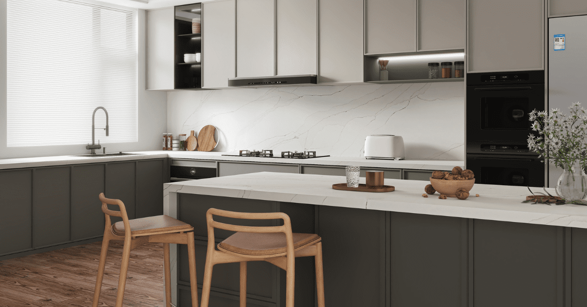 Engineered surfaces are also evolving. Ultra-compact materials such as Dekton and large-format porcelain provide durability and a sleek, seamless look, making them popular for waterfall islands and backsplashes.